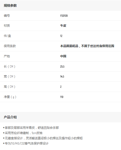 首頁>產品中心>手部防護>手套>世達氬弧焊接手套L